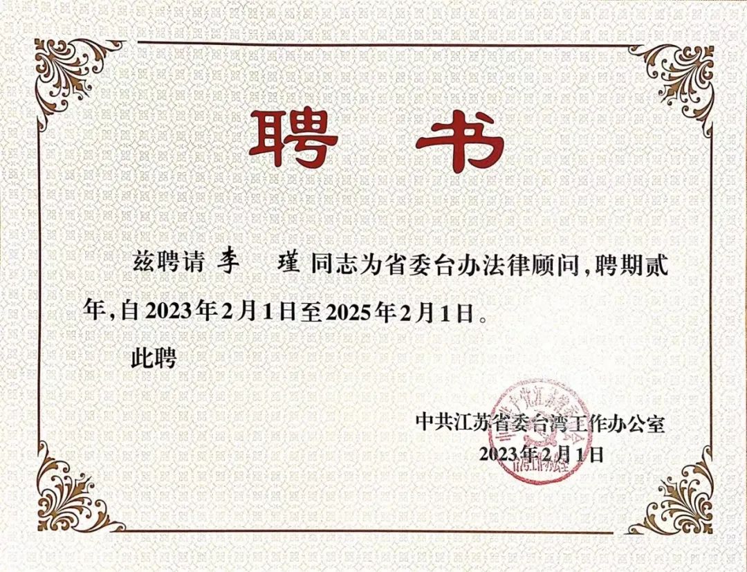 为深入推进依法行政,充分发挥法律顾问作用,进一步提高依法决策水平,近日,经聘期考核等次优秀,光明(南京)律师事务所副主任、高级合伙人李瑾律师续聘担任中共江苏省委台湾工作办公室法律顾问。